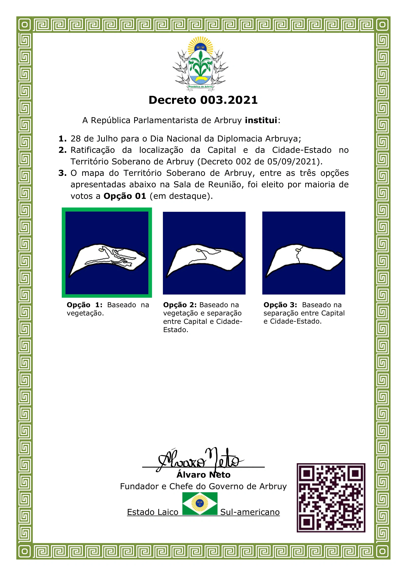 Decreto 003 de 12/09/2021. Día Nacional de la Diplomacía Arbruya (28/07). Ratificación de la Capital y Ciudad-Estado en el Território Soberano de Arbruy. Elección del mapa geográfico del Terrirório Soberano de Arbruy.