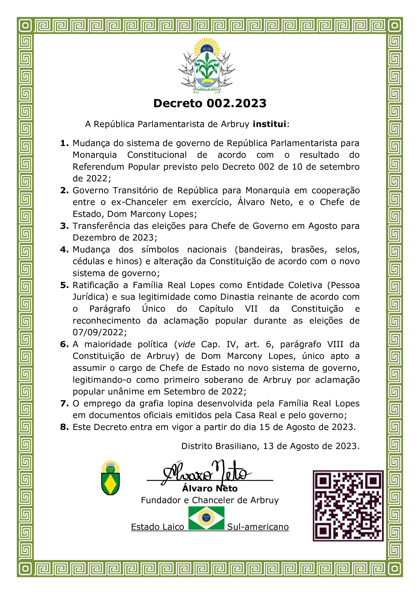 Decreto 002.2023 sobre alteração de República para Monarquia, Governo Transitório, Transferência das eleições para Chefe de Governo, mudança de símbolos nacionais, legitimação da dinastia, chefe de estado e grafia lopina. Entra em vigor dia 15 de agosto de 2023.