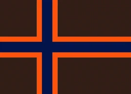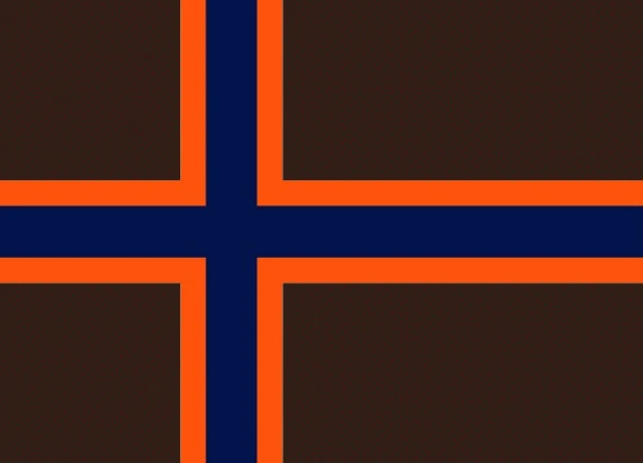 Consisting of a dark red-orange back and navy blue cross, along with two aquamarine lines around the side that are very short. Around one side, the flag has two yellow squares. The bottom stripe is gray, instead of the previously mentioned color.